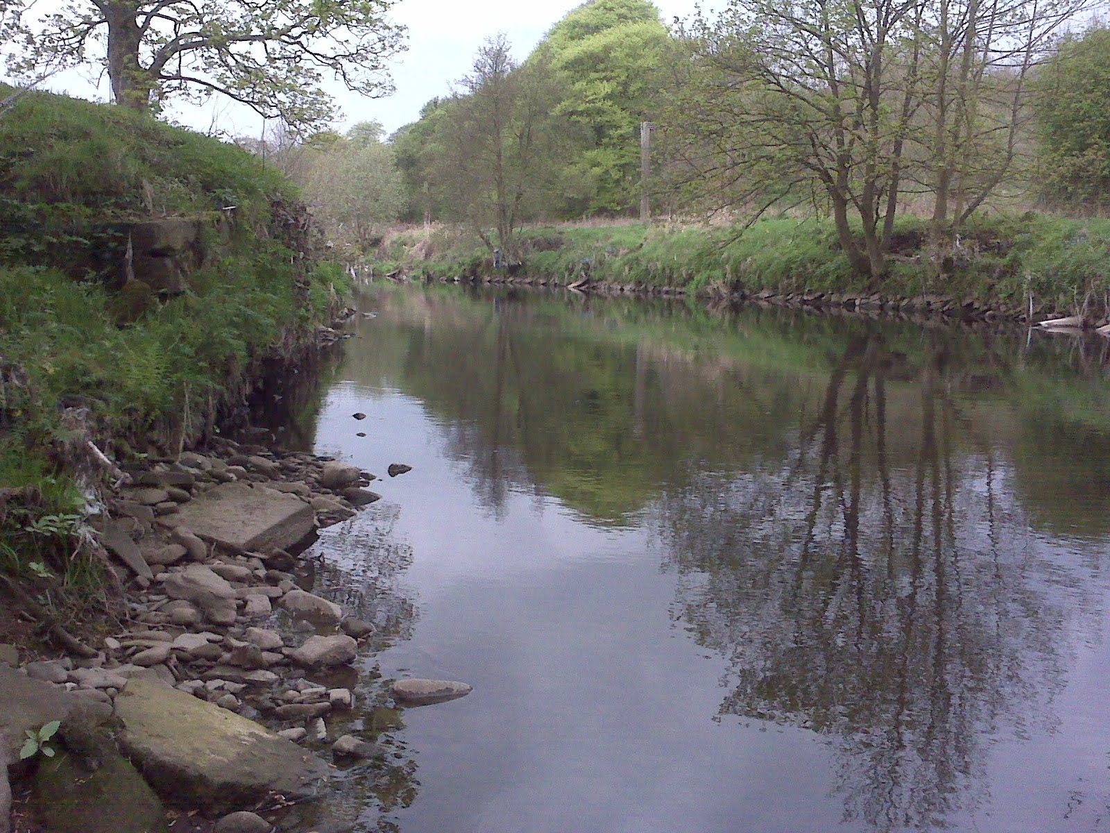 Stopped off on the way back home the other afternoon to have a look off a bridge at the state of the river & saw the odd swirl of a fish sipping down, remembering that I had some gear in the boot got me tempted but, apart from the waders all I had to wear was the suit & shirt I was in, undeterred I got in the waders in me duds & kept the shirt on - I must have looked like one of those tits you see in Trout & Salmon spey casting in a shirt & tie!
